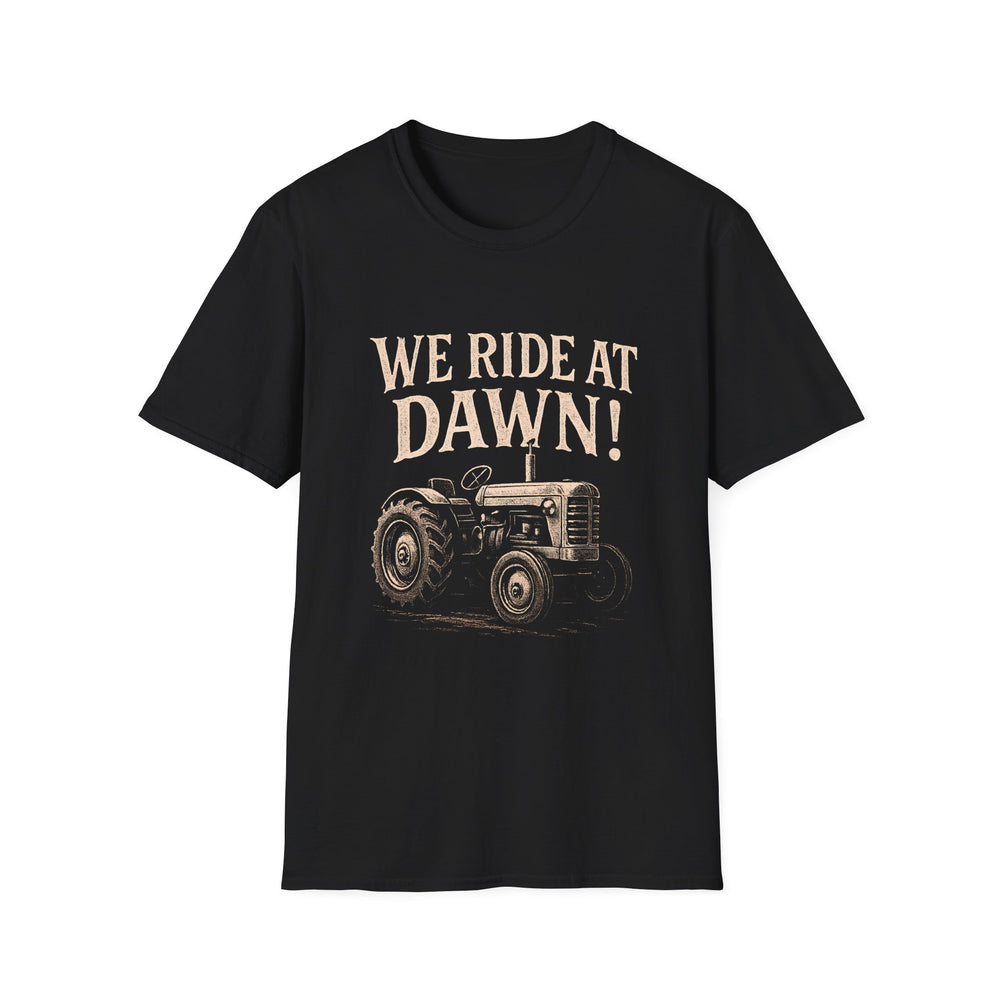 Vintage Tractor Graphic Tee - WE RIDE AT DAWN! Unisex T-Shirt, Gift for Farmers, Country Style, Casual Wear, Farm Shirt from $21.33